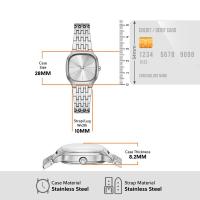 洗練されたモダンなデザインに仕上げたシルバートーンのステンレススチールウォッチ。存在感が際立つアイテムです。丸みのある28mmのスクエアケースに三針ムーブメントを搭載し、ゴールドトーンのサンレイダイヤルを組み合わせました。