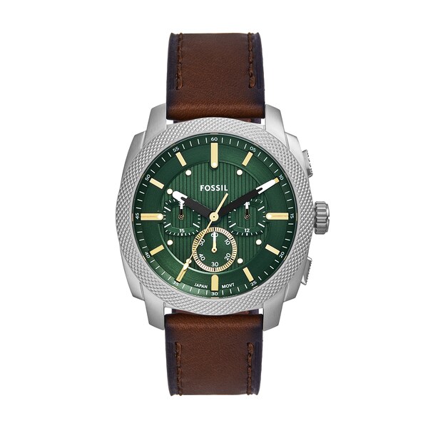 クラシックなアメリカの機械にインスパイアされたMACHINEクロノグラフ。印象的なローレット加工を施したトップリングが目を惹くデザインです。大胆な44mm径のケースに、質感のあるディテールを施した艶消し仕上げのグリーンのダイヤルを組み合わせました。ミネラルクリスタルのフェイスが保護を提供する、男性的な魅力が際立つモデルです。精確なクォーツクロノグラフムーブメントを搭載したこのラギッドなタイムピースは、リッチなブラウンのレザーストラップを備え、耐久性にも優れています。インダストリアル風のデザインが冴える存在感のあるウォッチです。