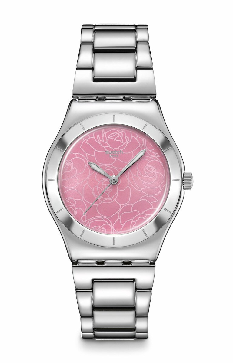 ホワイトの花柄がプリントされたサンレイピンクの文字盤、暗闇で光るシルバーカラーの時針と分針、そしてシルバーカラーの秒針を特徴とする、オシャレなステンレススチール製タイムピース。