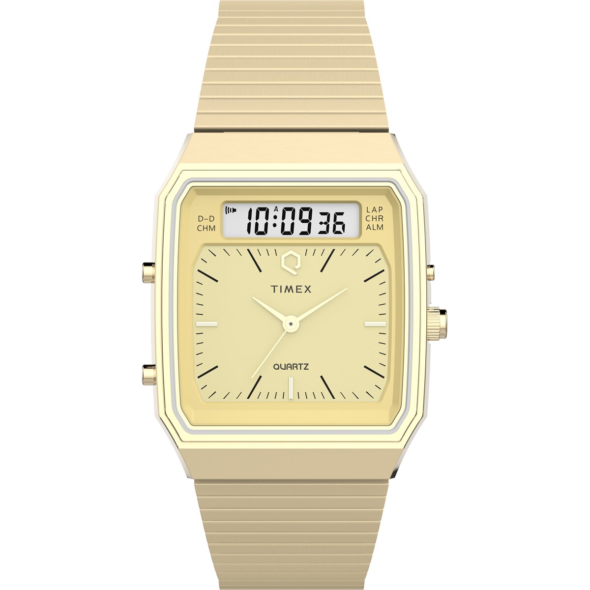 細身の針、ポリッシュ仕上げのクラウンとプッシャー、ブラッシュ仕上げのゴールドトーンのステンレススチールブレスレット、そしてオリジナルモデルを受け継ぐ「Q TIMEX」のロゴが、このアナデジドレスウォッチを特別な一本に仕上げています。まさに往年の名作が復活を遂げたユニークなモデルです。