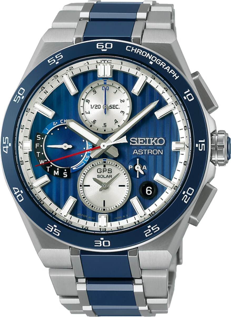Nexter GPSソーラー デュアルタイムクロノグラフレギュラーモデル初となるブルーセラミックスをベゼル、ブレスレット中駒、りゅうずトップに採用したワンランク上のスポーティデザインのモデルが登場。