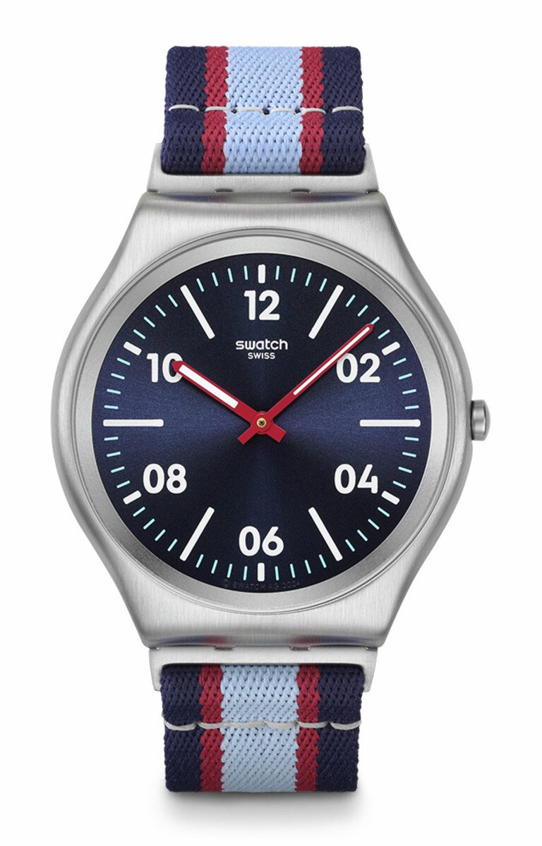 サンドブラスト仕上げのステンレススチール製ケース、ループ、ハーフバックルが、ダークブルーとバーガンディーカラーとライトブルーのストライプが入ったテキスタイルストラップと調和しています。