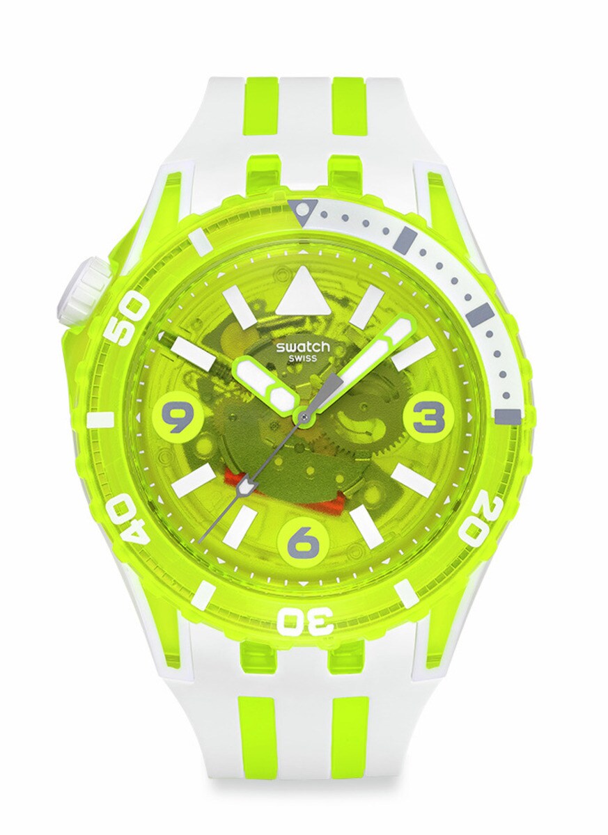 透明なイエローの文字盤のダイビングウォッチ。すべてに暗闇で光る効果が施された、ホワイトプリントのインデックス、グレープリントの数字、イエローの時針と分針、そしてグレーの秒針が特長で、バイオ由来素材グラスでカバーされています。ケースはマットホワイトBioceramicとシャイニーで透明なイエローのバイオ由来素材を組み合わせており、暗闇で光るグレーとホワイトのプリントを施したシャイニーで透明なイエローのバイオ由来素材ベゼル、10時位置にマットホワイトのBioceramic製クラウンを配しています。