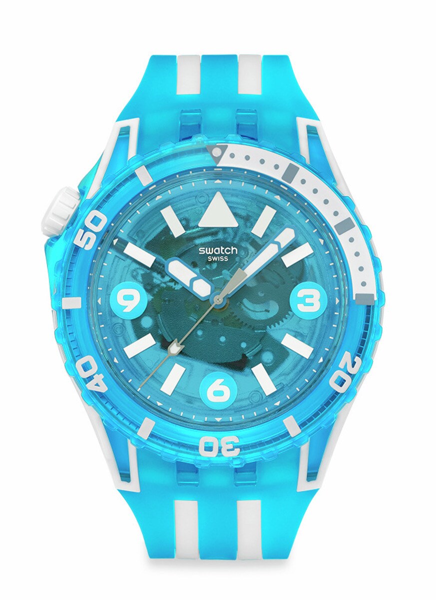 マットホワイトとマットで透明なブルーのストラップにマットで透明なブルーのループ、シャイニーで透明なブルーのバイオ由来素材バックルで時計全体をまとめています。