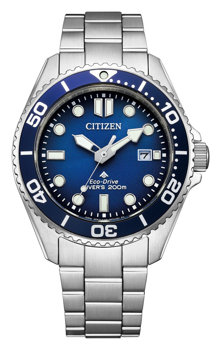 腕元になじみやすい40.6mmのケースを採用した正統派のデザイン。ダイバーズウオッチを初めて手にする方にもおすすめの1本です。回転ベゼルの外周全体に、やや深めの溝を刻んだオーソドックスな仕上がり。優れた操作性も実現しています。3連メタルバンドは、別体構造の中駒を用い、斜面をミラー仕上げにした立体感のある力強いデザイン。バックルは、ダイビングスーツを着用した際なども簡単に調整・装着できるラチェット付ダブルホールディングバックルを採用しています。ブルーとグリーン文字板は、中心から外側にかけてのグラデーションが、深く澄んだ海中を表現。シンプルながらも高級感のあるフェイスに仕上げています。*シチズンのウェブサイトより「MY CITIZEN」にお買い上げの腕時計をご登録いただくことで、延長保証などのさまざまな特典をご利用いただけます。