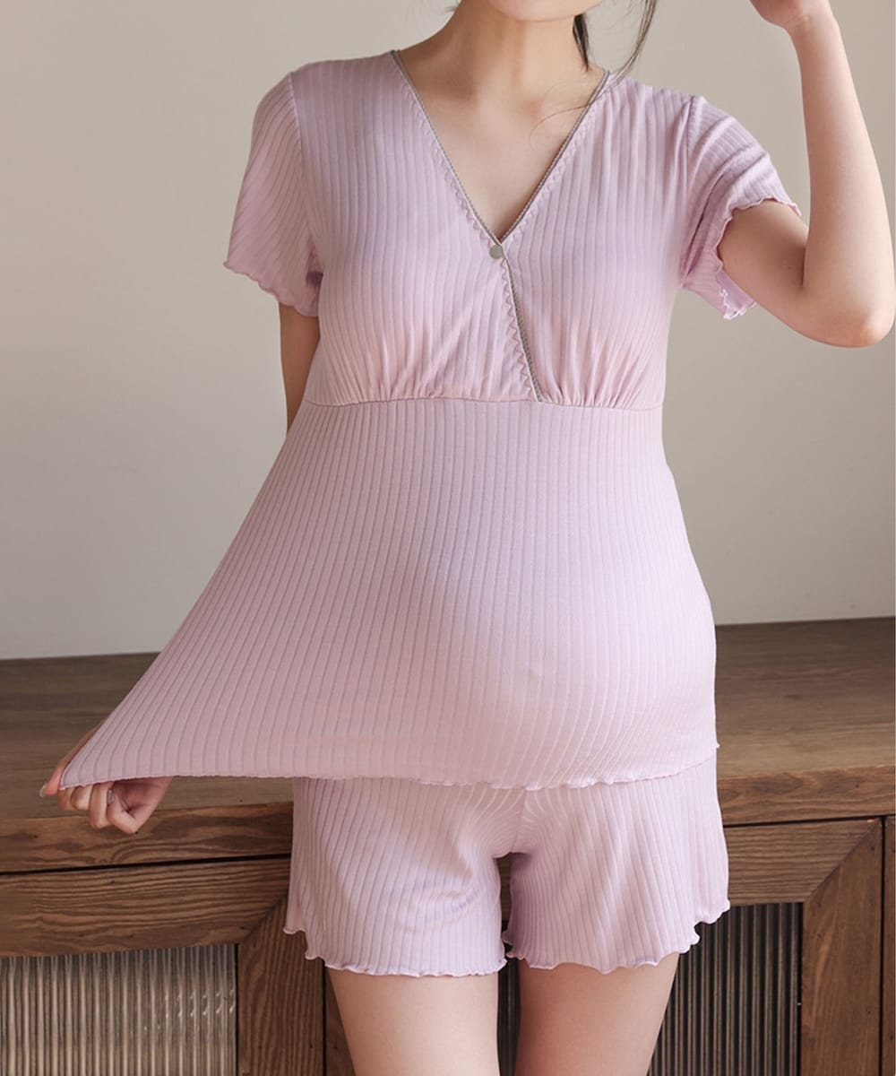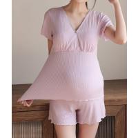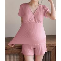 妊娠中のリラックスタイムにぴったりな、半袖トップスとショートパンツのルームウェアセット。柔らかなリブ素材がやさしく身体を包み込み、快適な着心地を提供します。