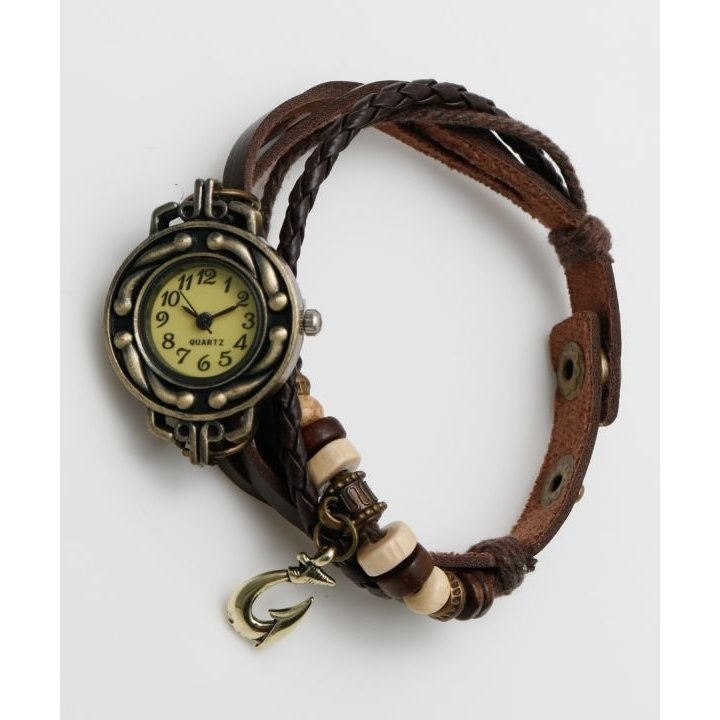 幸運の象徴フィッシュフックがついたレザーの腕時計。シンプルなコーディネートのアクセントにもおすすめです。