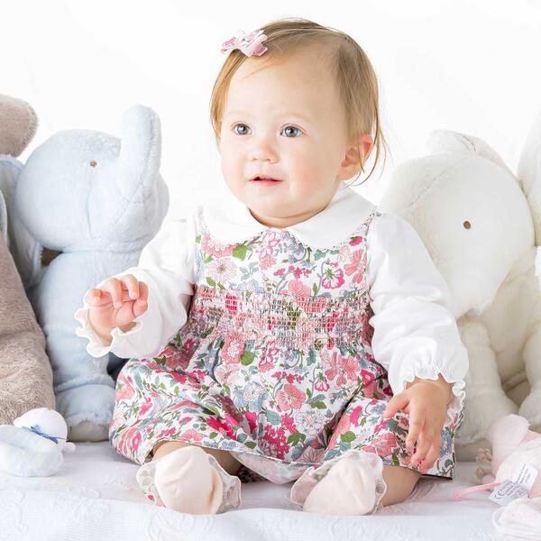 草原のように様々な花々が咲くリバティプリント(Daisy Morisia)を使用したベビー用ワンピースとブルマ 。