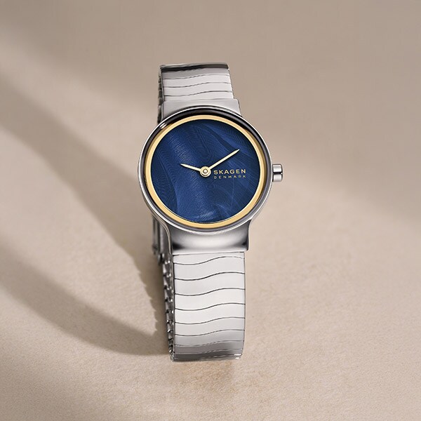 ブラッシュ仕上げを施したブルーダイヤルに、洗練されたシルバートーンの”S Wave”ステンレススチール製キャップ付きメッシュブレスレットを組み合わせ、モダンでミニマルな美しさを表現しています。すっきりとした二針デザインがアクセントを添えます。