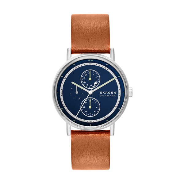 シルバートーンのステンレススチール製ケースにリッチなブラウンレザーストラップを組み合わせたタイムレスなルックに、ダークブルーのサンドブラストダイヤルがモダンなタッチを添えています。