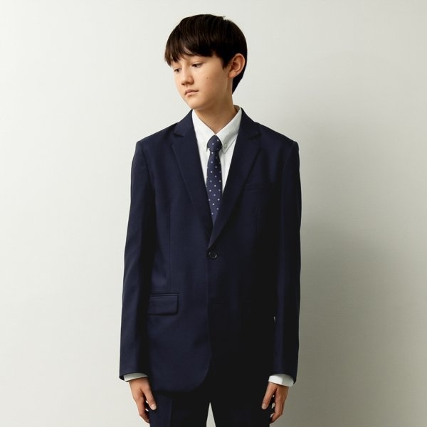 背の高い子でもバランスよく見えるよう、バランスのよい着丈。第一ボタンの位置や、ポケットのバランスなど細部にこだわったジャケットに仕上りました。