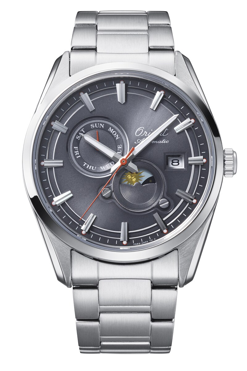 オリエントのコレクションでは珍しいグレーのニュアンスカラー文字板は、円弧を描いた特長的な放射仕上げや立体的な楔型インデックスと調和して、『オリエントストレット』シリーズの都会的なデザインが一段と際立ちます。