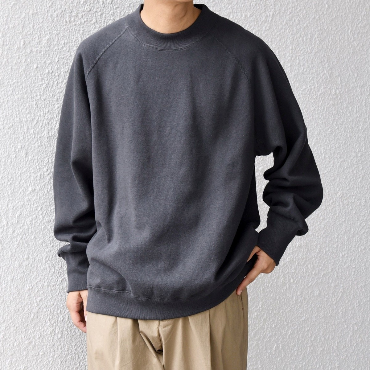 希少な旧式編み機を使用した拘り素材を使用したセミモックネックのスウェット