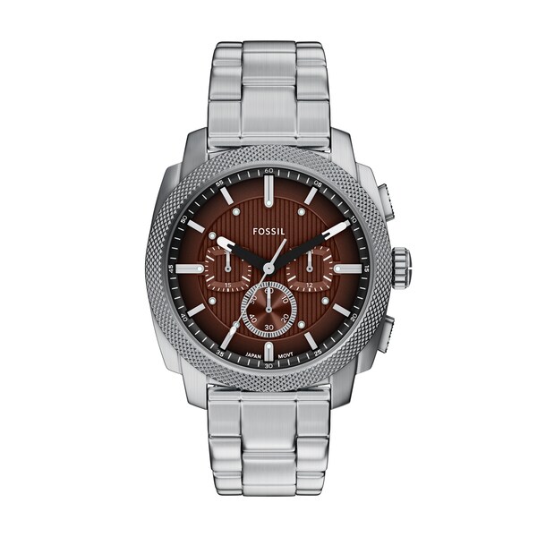 クラシックなアメリカの機械にインスパイアされたMACHINEクロノグラフ。印象的なローレット加工を施したトップリングが目を惹くデザインです。大胆な44mm径のケースに、質感のあるディテールを施したブラッシュ仕上げのリッチなブラウンのダイヤルを組み合わせ、ミネラルクリスタルのフェイスで保護した、マスキュリンな魅力が際立つモデルです。精確なクォーツクロノグラフムーブメントを搭載したこのラギッドなタイムピースは、丈夫なステンレススチールブレスレットを備え、耐久性にも優れています。インダストリアル風のデザインが冴える存在感のあるウォッチです。