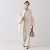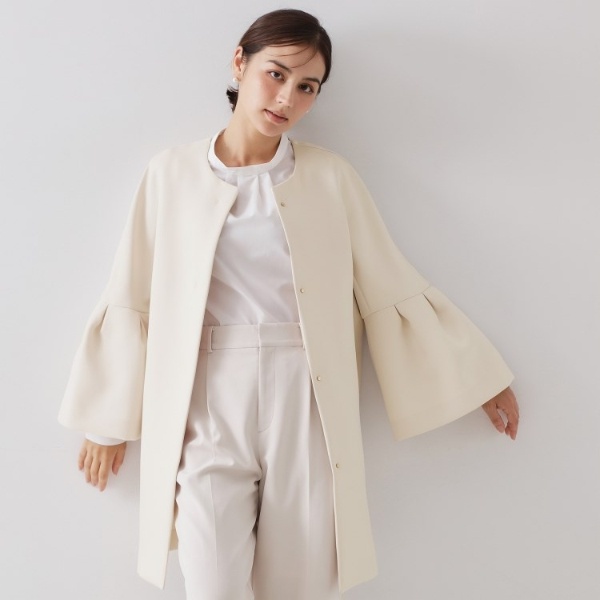 トリプルクロスで仕立てた、クリーンできれいな印象のノーカラーミドルコート