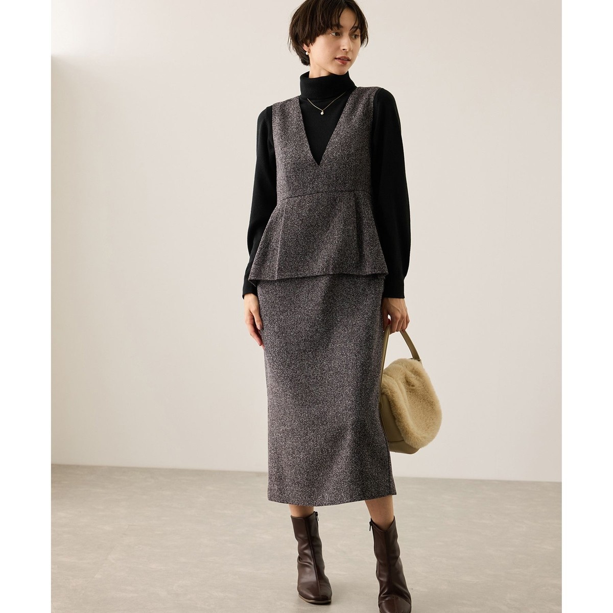 ・タートルニットを合わせて、通勤にもおすすめの上品な秋冬の大人コーデに。