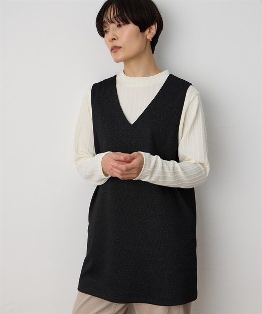 重ねるだけで決まる上品レイヤードチュニックすっきりとしたVネックベストと、柔らかな質感のインナーがセットになったアンサンブルチュニック。