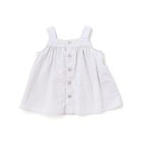 ハリのあるタイプライター生地にピンタックでギャザーを寄せて広がりのあるシルエットと3つのリボンが特徴のワンピースとブルマのセットです。