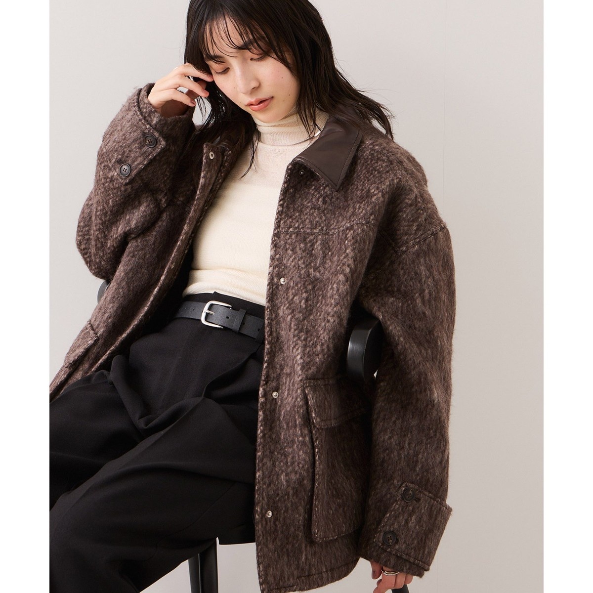 柔らかな素材感の中に、レザーの上品なアクセントが加わり、羽織るだけで女性らしいメリハリと華やかさが生まれます。ゆとりのあるシルエットで冬の厚手ニットの上からも着やすく、スカートにもパンツにも合わせやすい万能バランスに仕上がっています。フェイクレザーの襟が顔まわりをすっきりと見せ、カジュアルな着こなしにも品を添えてくれるのも魅力。デイリーからお出かけスタイルまで幅広く使える、大人フェミニンな印象の一枚です。