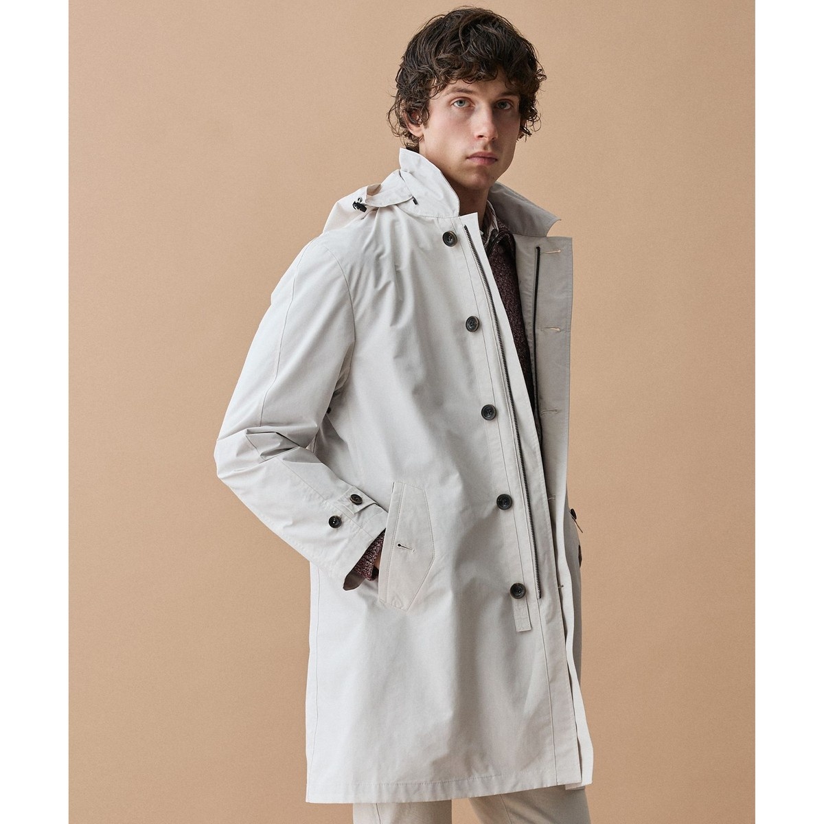 フードは衿裏のコンシールファスナーでスマートに着脱可能。取り外してもすっきりとした印象を保ち、2WAYの着こなしが楽しめます。シーンを選ばない定番のステンカラーデザインは、ビジネスからカジュアルまで幅広く対応。本水牛の焼き釦やウエストのスピンドルが、細部にまでこだわった上質感を演出します。肩はスプリットショルダー仕様で、着る人の体型に自然にフィットし、美しいシルエットをキープ。裏地にはオリジナルプリントを施し、見えない部分にも遊び心をプラスしました。