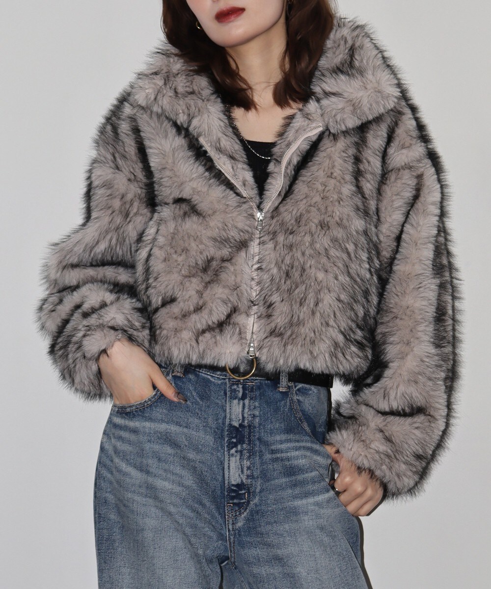 ・毛足の長さや色合いが異なるフェイクファーを組み合わせた、表情豊かなショート丈ブルゾン。