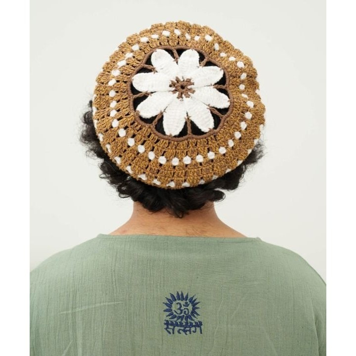 頭に咲く一輪の花をイメージしたネパールの手編みベレー帽。通気性の良い編み地と素朴な風合いが特徴で、ナチュラルで愛らしい装いを演出するアイテム。