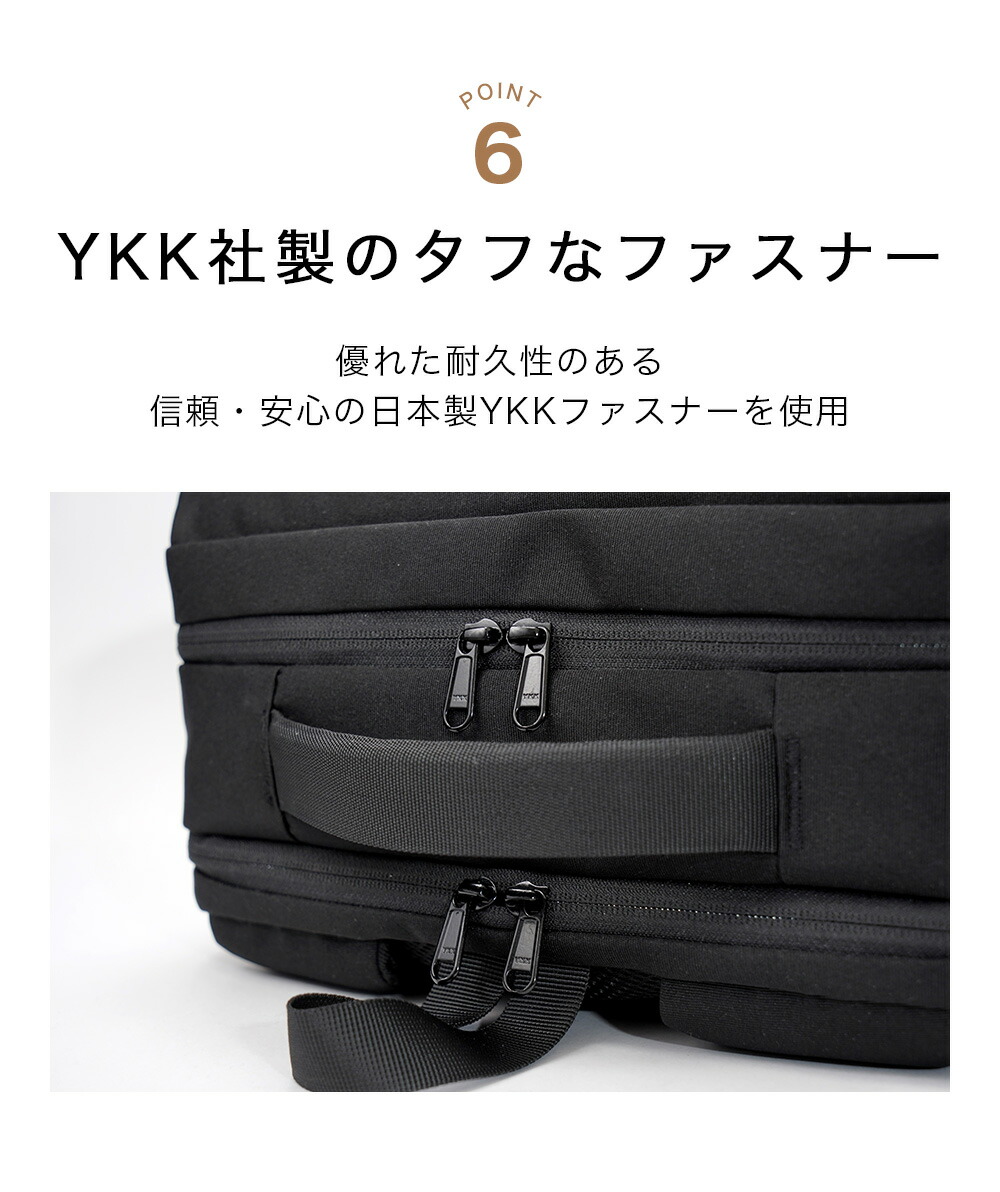 すべてのファスナーが優れた耐久性の信頼・安心の国産YKK使用(外側は防水機能ファスナー)耐摩耗・生活防水コーティング加工した生地でお手入れも簡単。