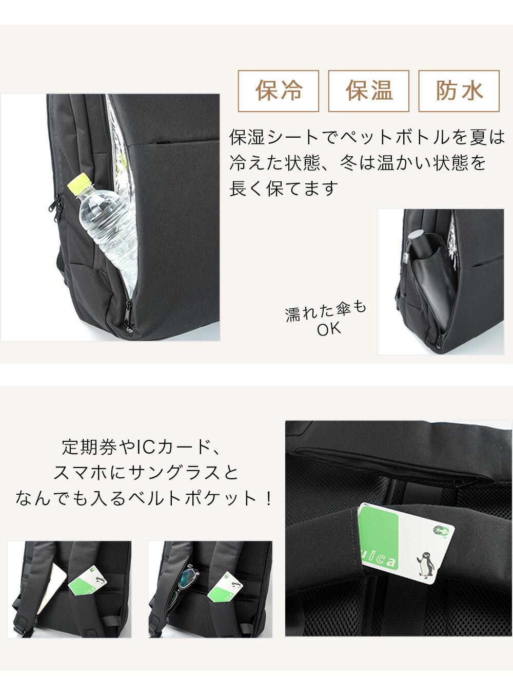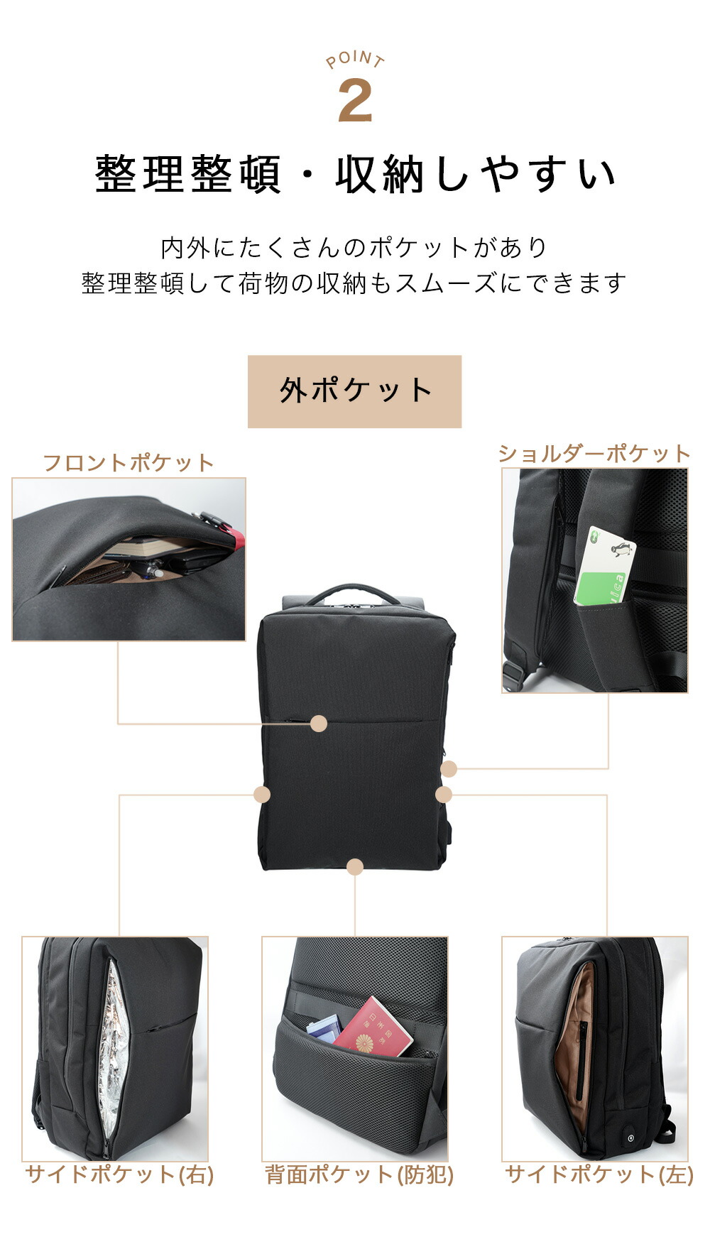 外付けポケットや紐やバックルがないので、満員電車での引っ掛けやガチャガチャ音が気にならない。
