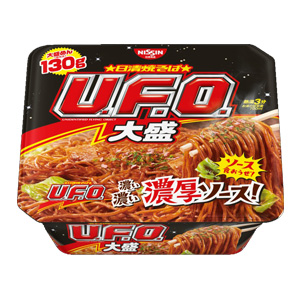濃い濃い濃厚ソースがうまい! 日清焼そばU.F.O.の大盛サイズ。具材は、大切りキャベツと豚肉、別添で青のりと紅生姜のふりかけ付です。