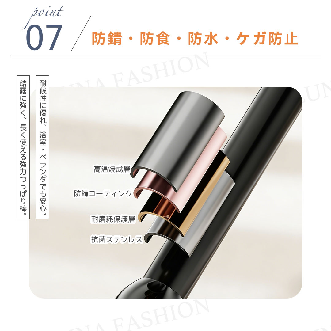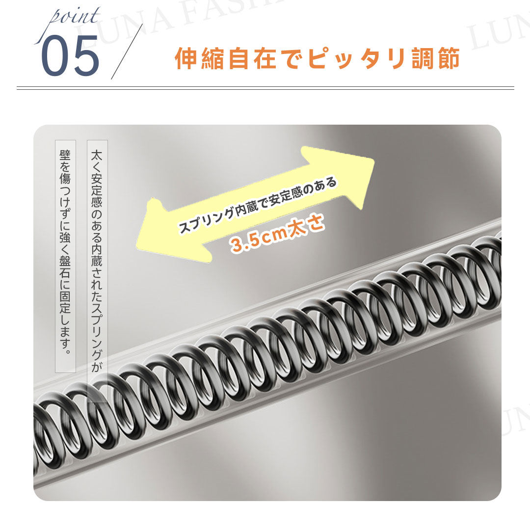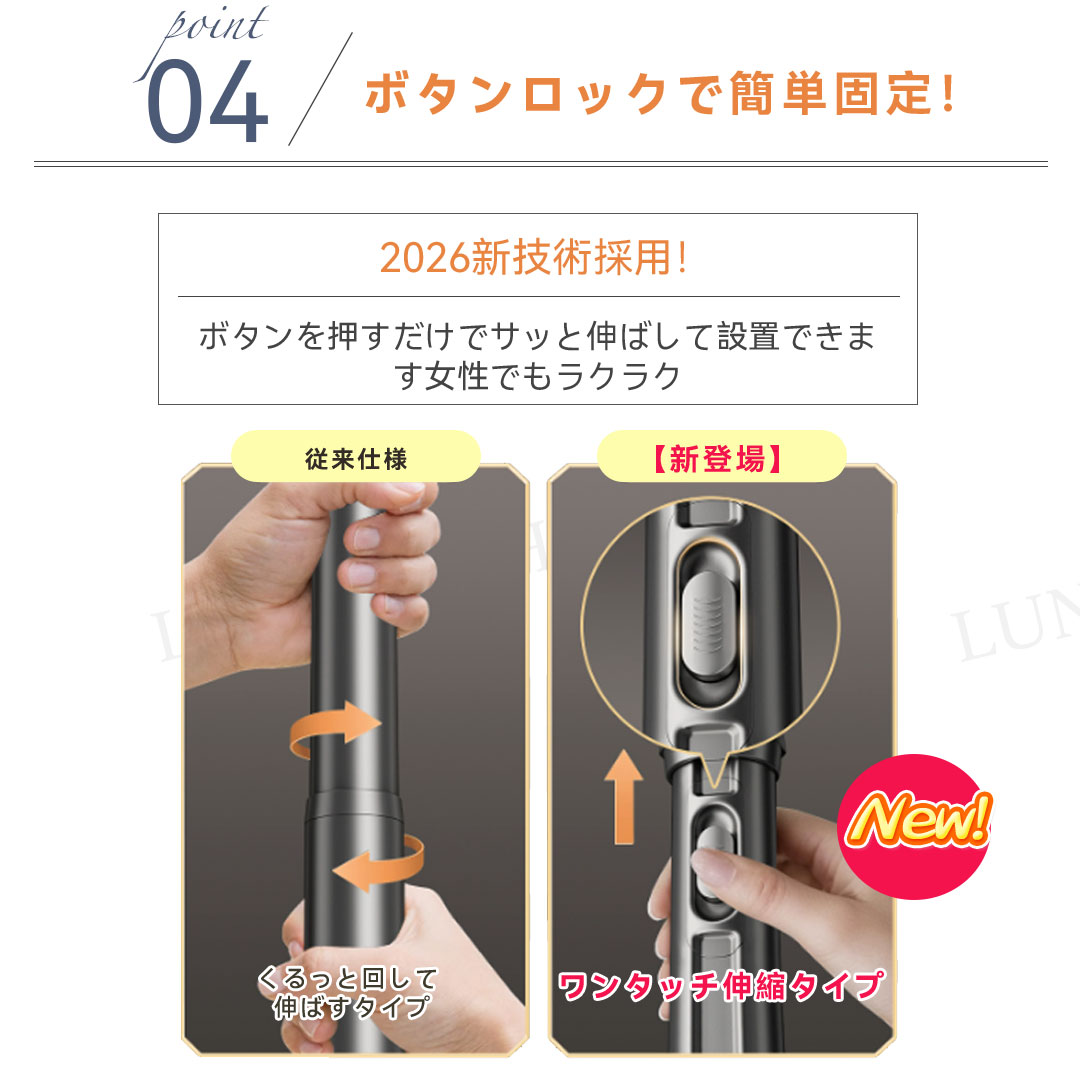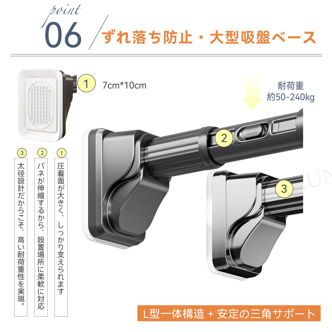 ワンタッチ式超強力突っ張り棒(9サイズ伸縮、耐荷重50-240kg、3色展開)。素材は高品質炭素鋼(ステンレスコーティング)、直径約3.2cmの超太設計で強力耐荷重を実現。最新のワンタッチボタン式で伸縮が簡単、女性一人でもスムーズに設置可能。端部には7×10cmの大型滑り止めゴムを採用し、L型構造と三角サポートで壁面にしっかり固定。防水・防サビ加工済みで浴室やバルコニーでも使用可能。9サイズ展開(70cm〜490cm)、耐荷重はサイズにより50〜240kg。カラーはホワイト、シルバー、ブラックの3色。穴あけ不要で賃貸にも安心。組立簡単で取付説明書付き。クローゼット、洗面所、キッチンなど多用途に活躍します。