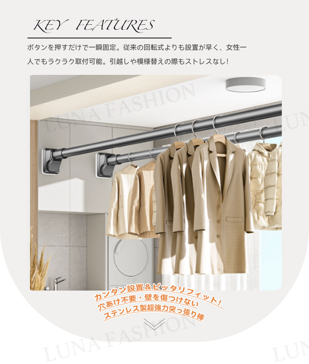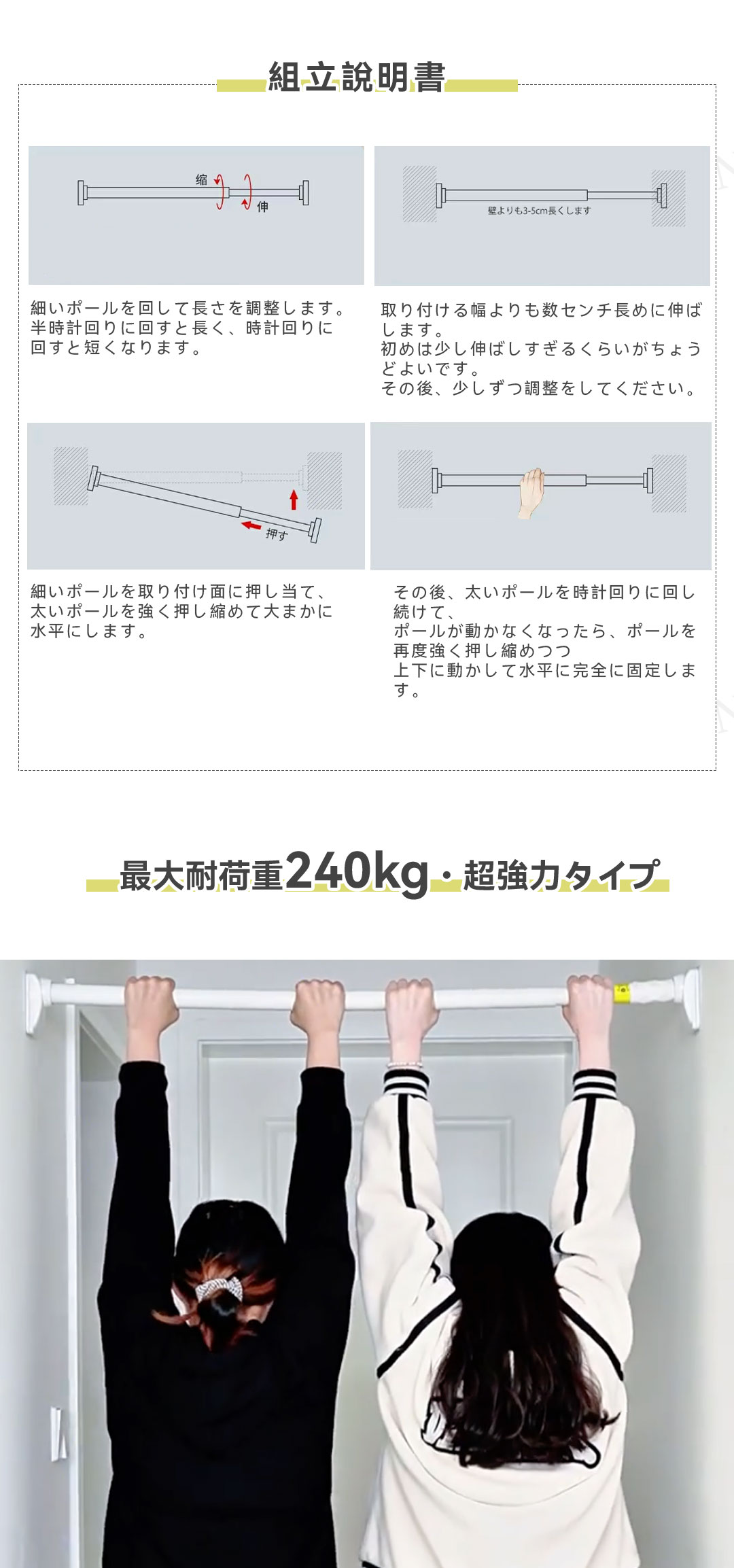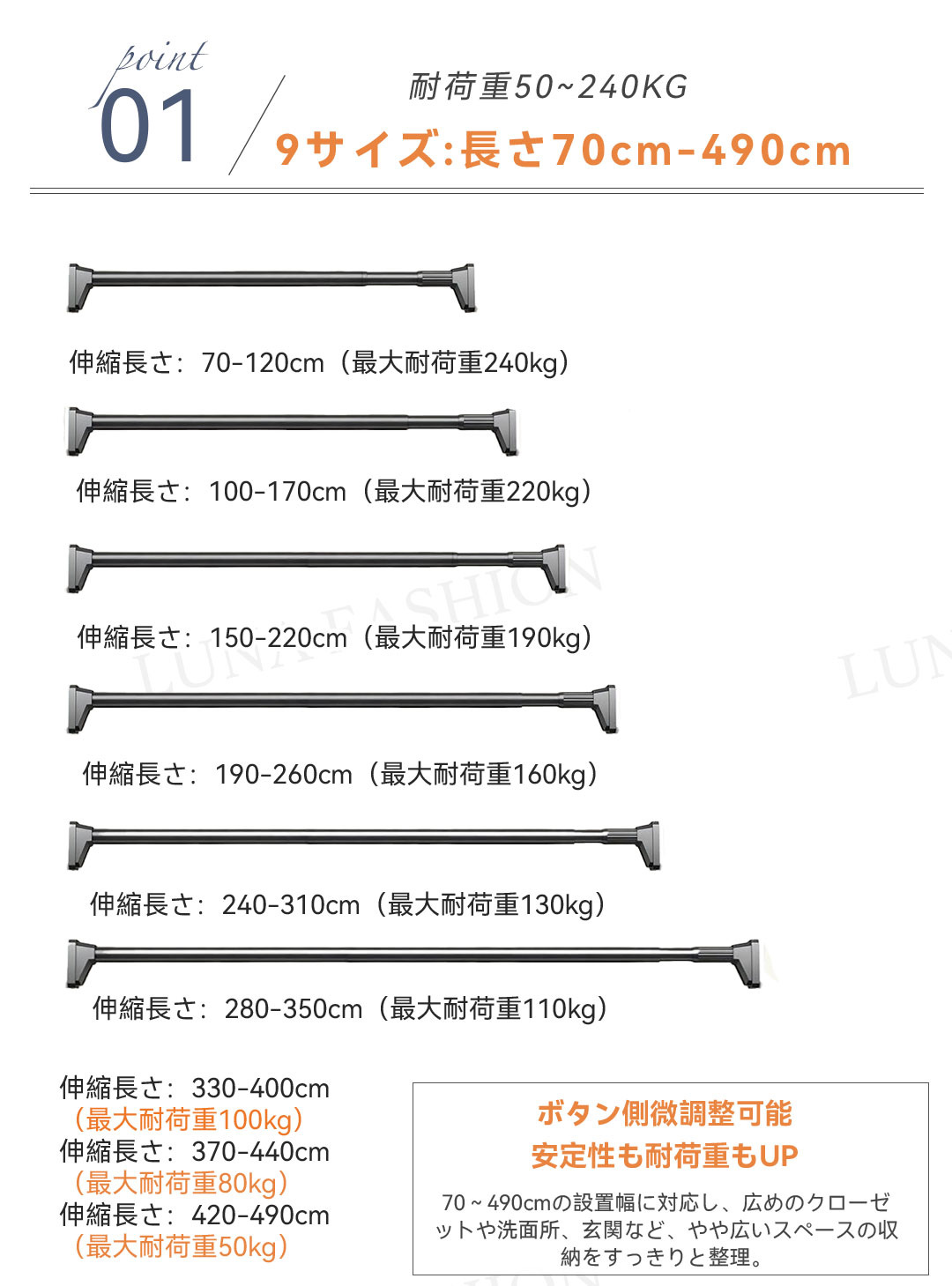 ワンタッチ式超強力突っ張り棒(9サイズ伸縮、耐荷重50-240kg、3色展開)。素材は高品質炭素鋼(ステンレスコーティング)、直径約3.2cmの超太設計で強力耐荷重を実現。最新のワンタッチボタン式で伸縮が簡単、女性一人でもスムーズに設置可能。端部には7×10cmの大型滑り止めゴムを採用し、L型構造と三角サポートで壁面にしっかり固定。防水・防サビ加工済みで浴室やバルコニーでも使用可能。9サイズ展開(70cm〜490cm)、耐荷重はサイズにより50〜240kg。カラーはホワイト、シルバー、ブラックの3色。穴あけ不要で賃貸にも安心。組立簡単で取付説明書付き。クローゼット、洗面所、キッチンなど多用途に活躍します。