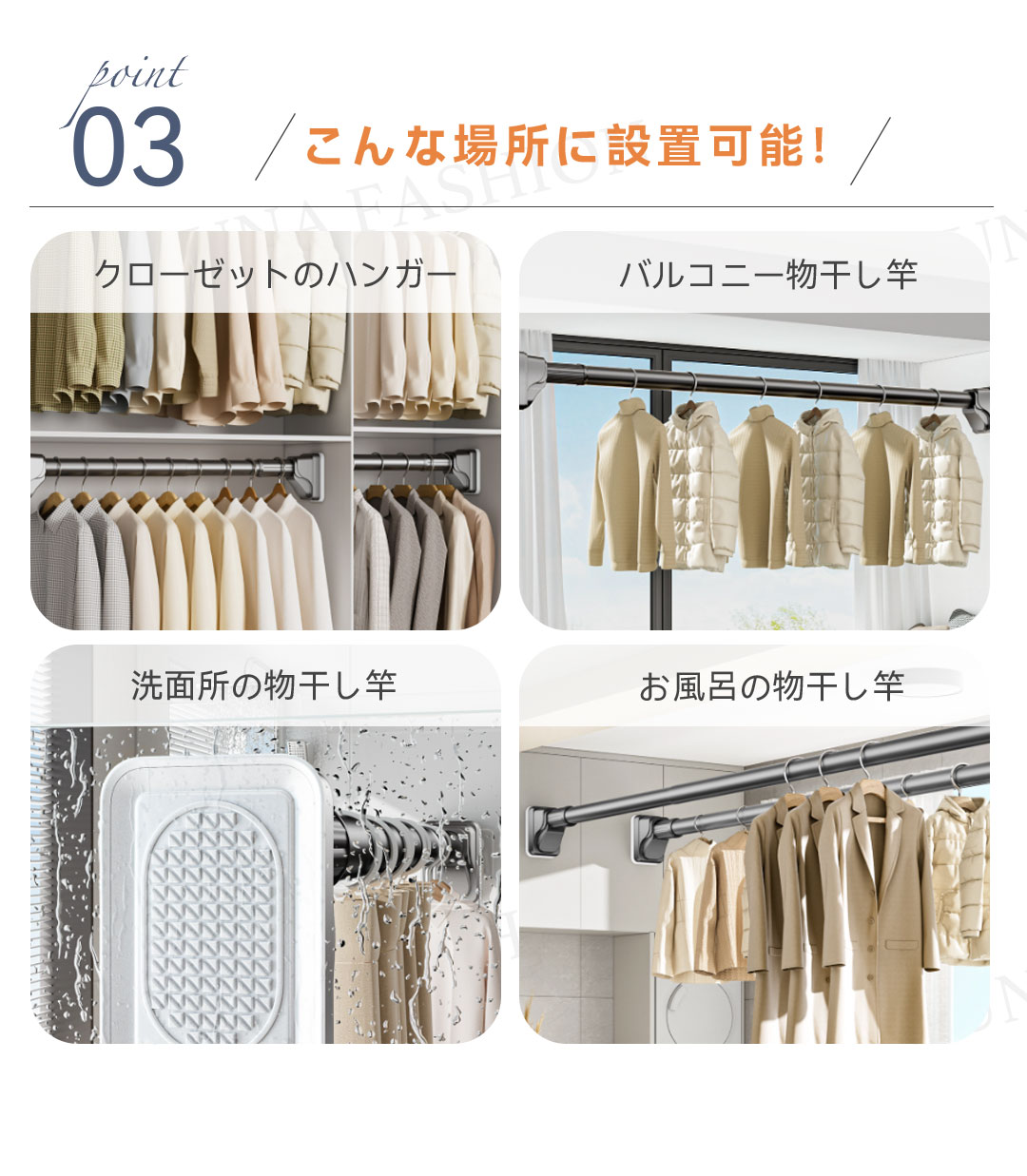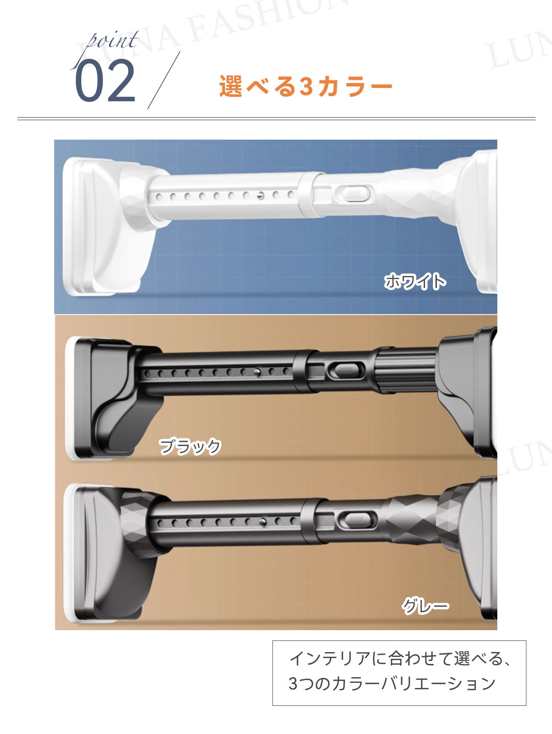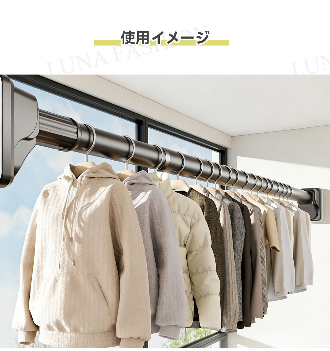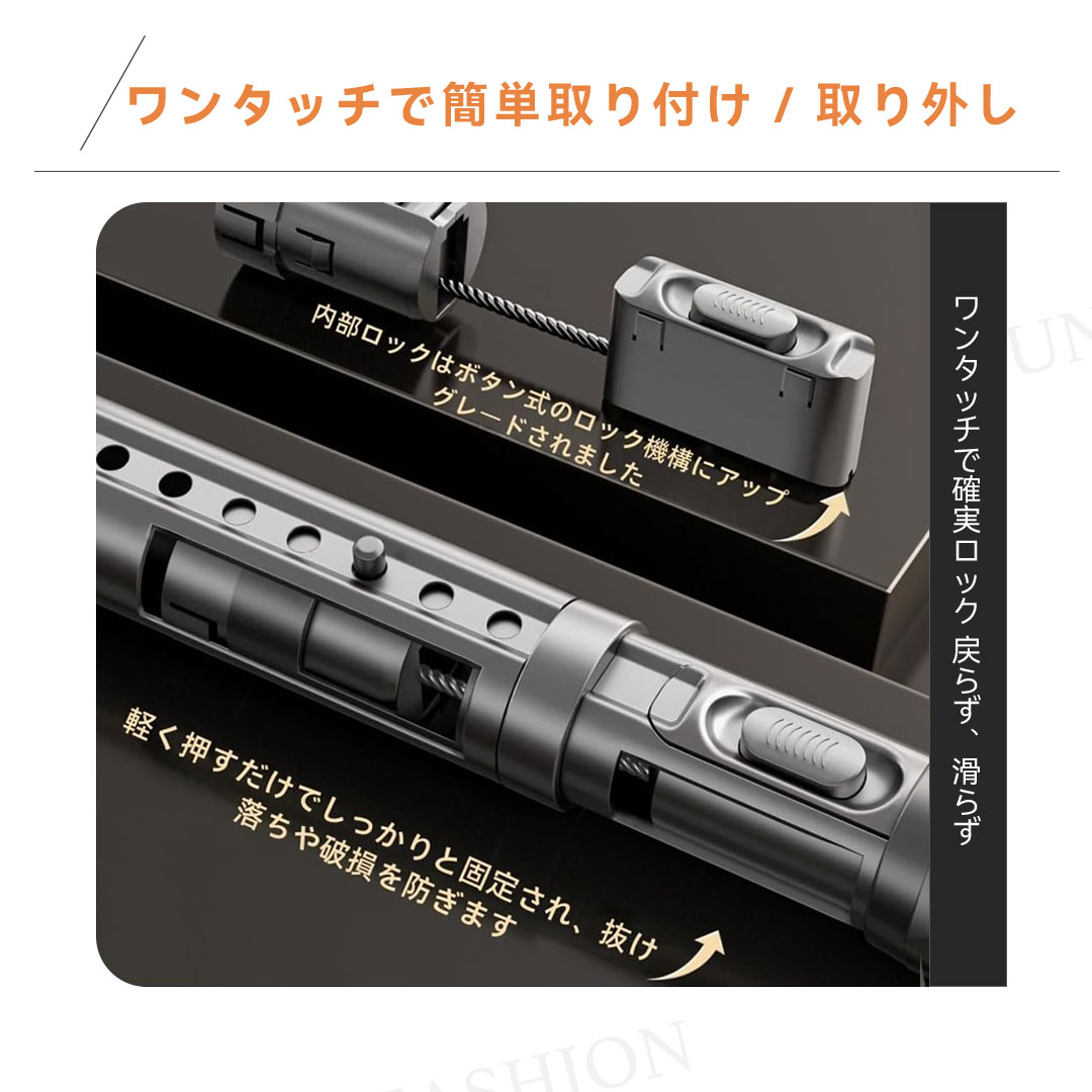 ワンタッチ式超強力突っ張り棒(9サイズ伸縮、耐荷重50-240kg、3色展開)。素材は高品質炭素鋼(ステンレスコーティング)、直径約3.2cmの超太設計で強力耐荷重を実現。最新のワンタッチボタン式で伸縮が簡単、女性一人でもスムーズに設置可能。端部には7×10cmの大型滑り止めゴムを採用し、L型構造と三角サポートで壁面にしっかり固定。防水・防サビ加工済みで浴室やバルコニーでも使用可能。9サイズ展開(70cm〜490cm)、耐荷重はサイズにより50〜240kg。カラーはホワイト、シルバー、ブラックの3色。穴あけ不要で賃貸にも安心。組立簡単で取付説明書付き。クローゼット、洗面所、キッチンなど多用途に活躍します。
