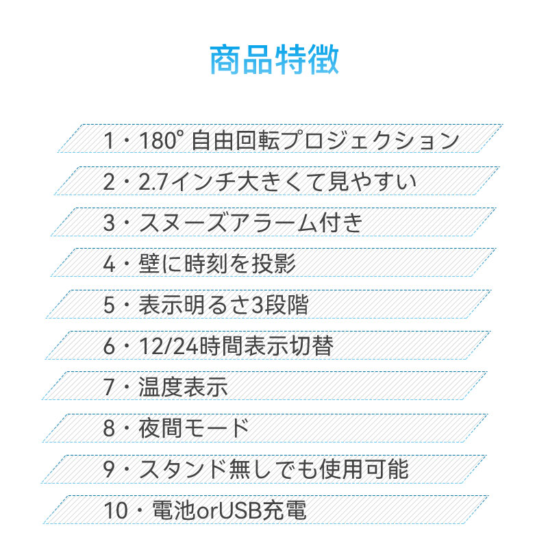 LED大画面ミラープロジェクション目覚まし時計は、時間を壁や天井に投影。広い空間でも視認性が高く、夜間の目覚めをスムーズに。180°回転調整で、ベッド周りに合わせてカスタマイズ可能。日本の生活スタイルに合致した設計です。