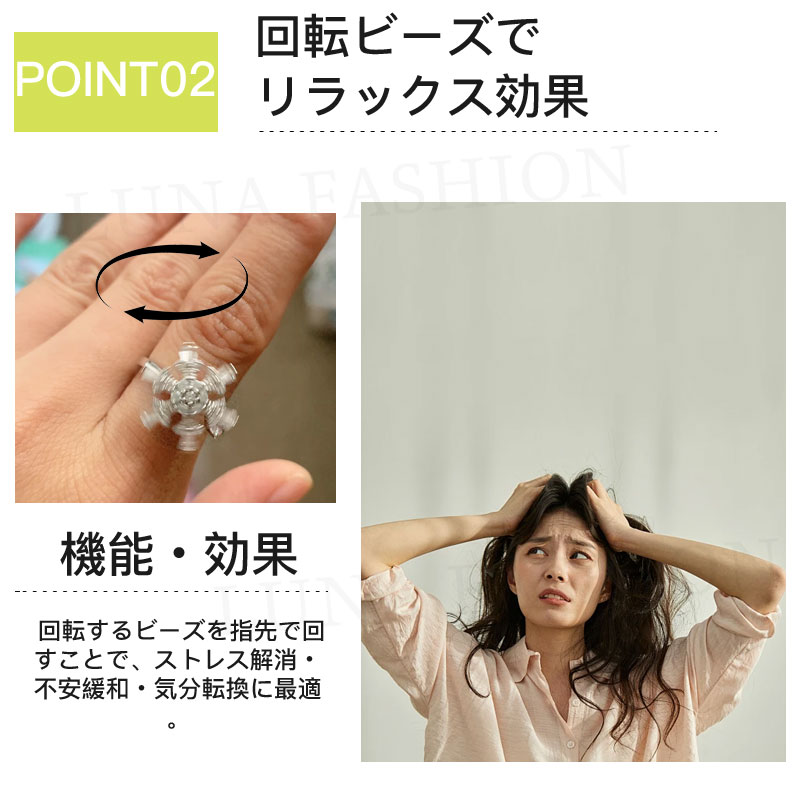 【ストレス軽減に】回転するビーズが指先の心地良い刺激となり、ストレスや不安を和らげるサポートをします。リラックスしたい時や、集中力を高めたい時に、そっと触れてみてください。気分転換にもぴったりです。