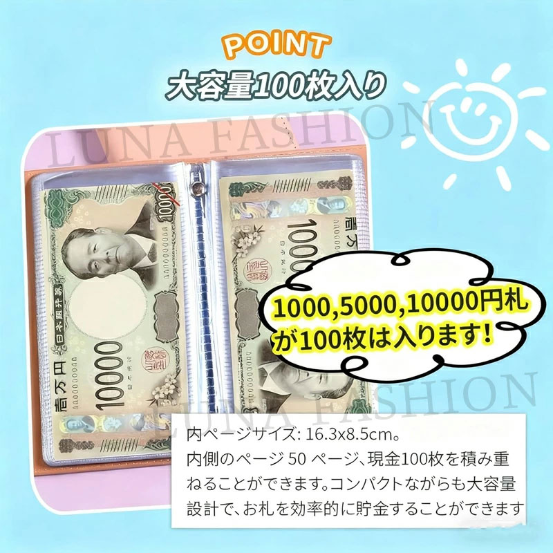 【貯金箱 札 - 大容量】50ページあり、現金100枚を積み重ねることができます。コンパクトながらも大容量設計で、お札を効率的に貯金することができます。