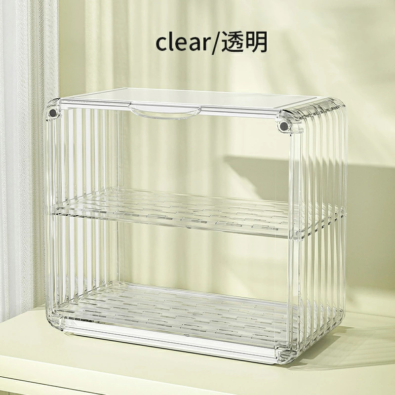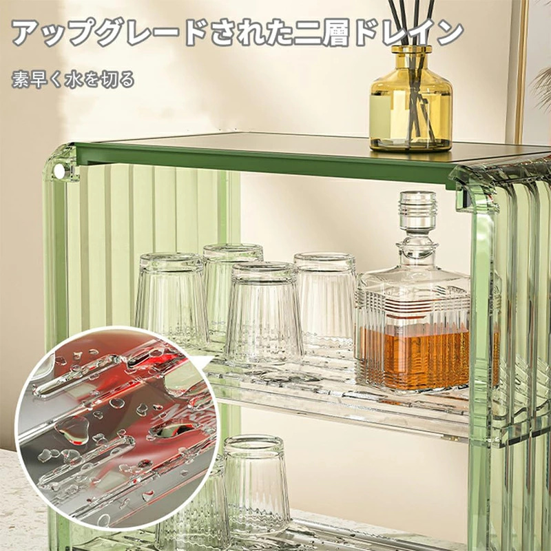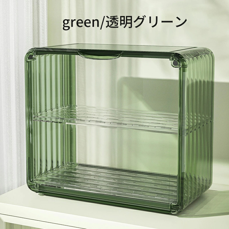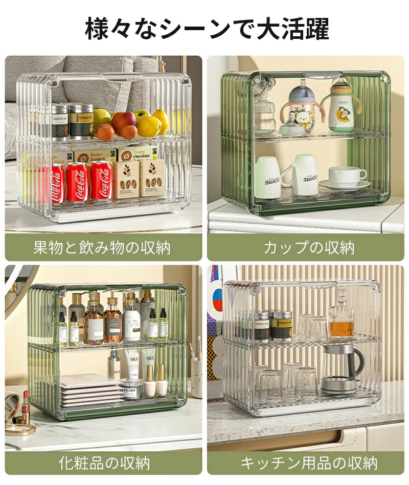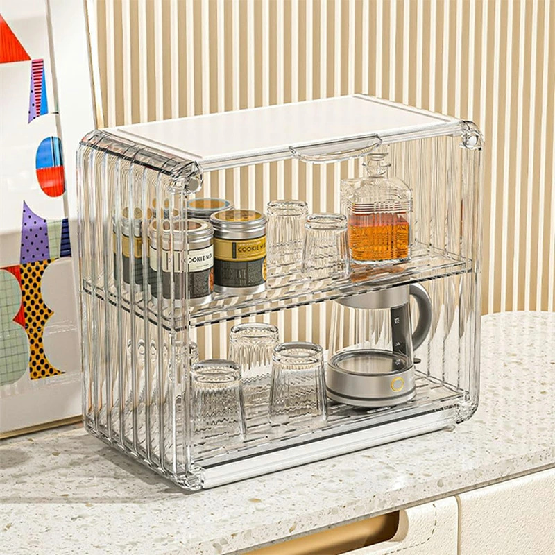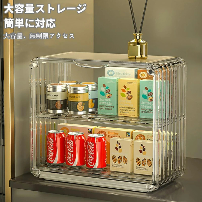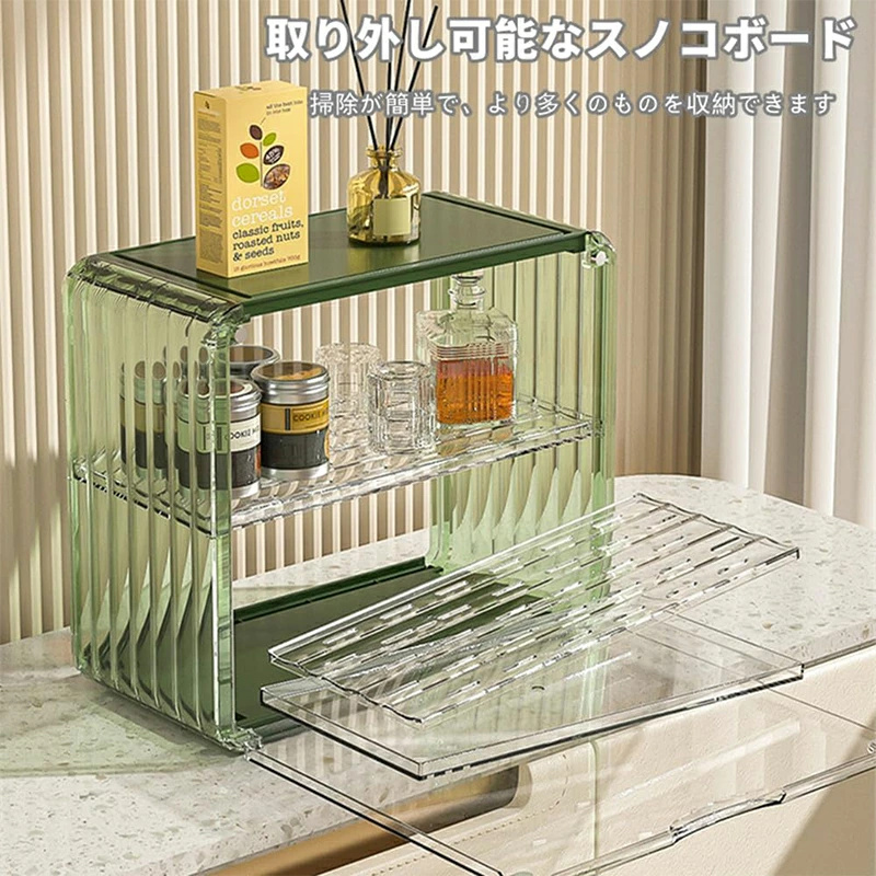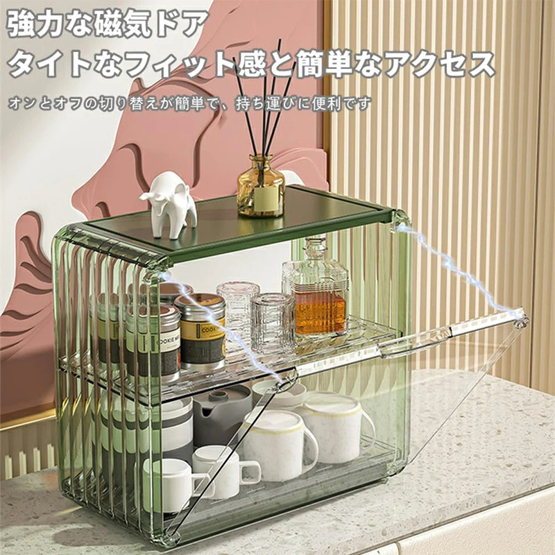 ミニ食器棚 2段 クリア 収納棚 キャビネット アクリル扉付き 台所卓上収納 小物入れ 水切り付き マグネット付き カップ 化粧品 収納 防塵防水 透明 積み重ね