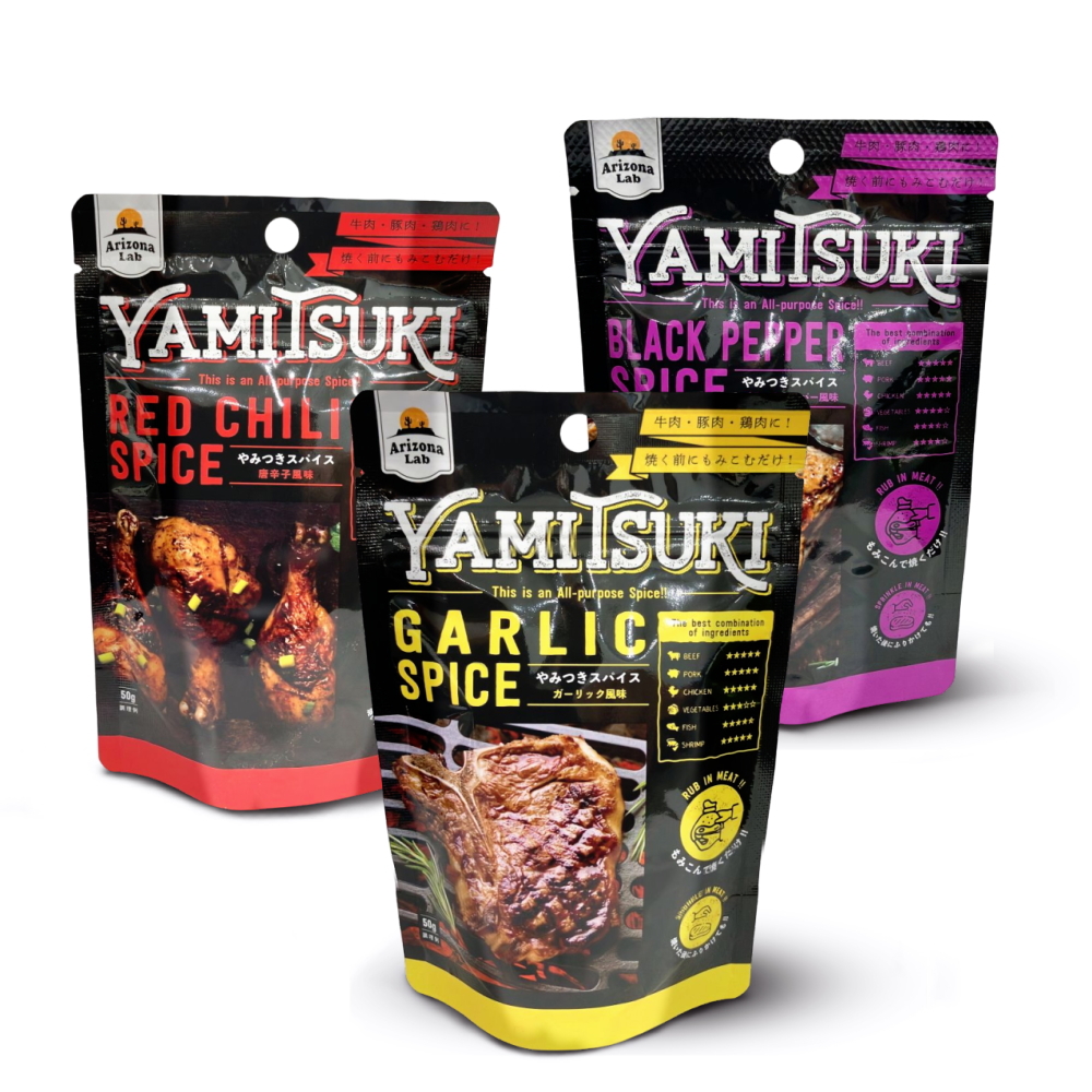 | COMMENT -商品について- やみつきスパイス YAMITSUKI SPICE 3種セット ガーリック + ブラックペッパー + 唐辛子 牛肉、豚肉、鶏肉にもみこんで焼くだけで、やみつきBBQ料理が完成します。魚介のグリルや野菜炒め、炒飯や焼きそばなどにもご使用いただけます。 【クミンなど10種のスパイスをブレンド】 スパイスに精通した開発メンバーが厳選したスパイスと調味料をブレンド。 “やみつきになる美味しさ” を追い求めて何度も試作を繰り返し、自信をもっておすすめできる配合が生み出されました。 【万能スパイス】 メニュー専用調味料が広がりを見せるなかで、肉類のほか野菜や魚介類にも合う使い勝手の良さにもこだわりました。 キャンプ、バーベキュー、日々の家庭料理にお使いいただける万能スパイスです。 【やみつきスパイスは3種類】 BLACK PEPPER SPICE やみつきスパイス ブラックペッパー風味 RED CHILI SPICE やみつきスパイス 唐辛子風味 GARLIC SPICE やみつきスパイス ガーリック風味 【やみつきスパイス】【やみつきスパイス】【Yamitsuki SPICE】【スパイス通信販売】【ビーフスパイス】【チキンスパイス】【ポークスパイス】【牛肉スパイス】【鶏肉スパイス】【豚肉スパイス】 SPEC -商品詳細-