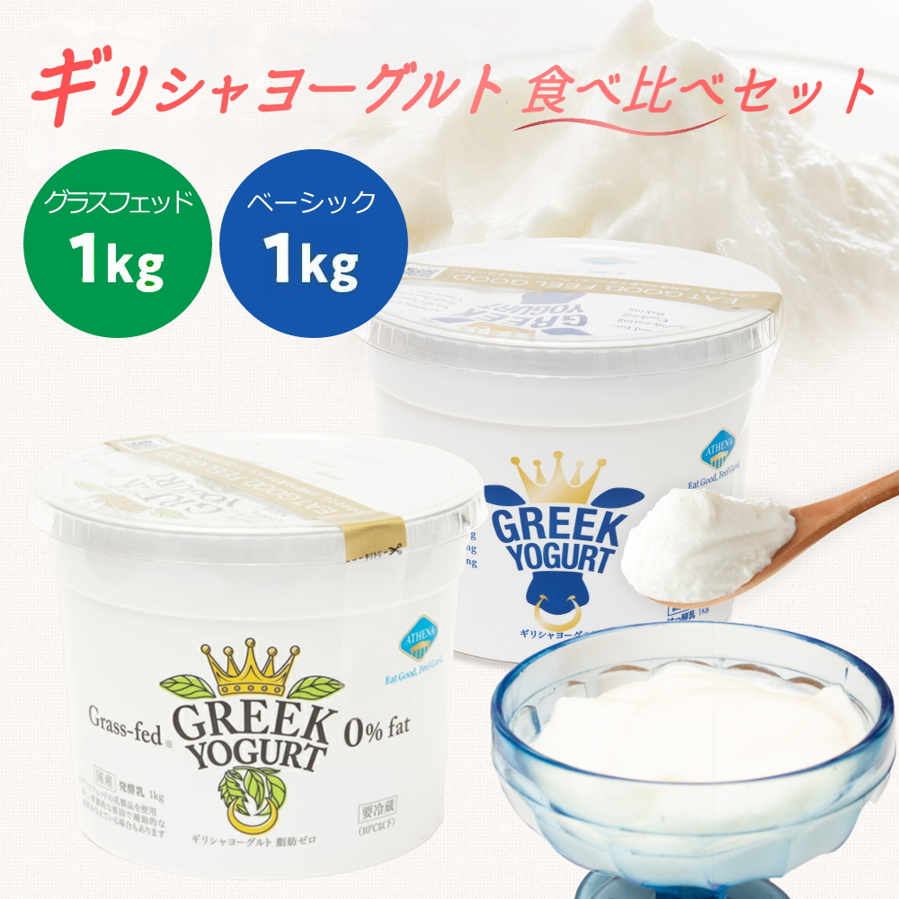 | COMMENT -商品について- 【是非比べてみてください。】 ATEHNA(アテナ)のヨーグルト食べ比べセット登場! ギリシャヨーグルト アテナ グリーク ヨーグルト そのままはもちろん、 サラダのトッピング、 ディップソースやドレッシング… ステーキや魚のグリルに添えて… タンドリーチキンの漬け込みに… 「漬物に使っています!」という方も…! 美味しくヘルシーな食生活を送られたい方におすすめです! 「ATHENAギリシャヨーグルト」は、アテネ農業大学乳製品研究所が認めた、ギリシャの伝統的な菌株であるサーモフィラス菌(ACA DC0029R)を使用。 【ギリシャヨーグルト】 とても濃厚でクリーミーな味わいのギリシャヨーグルト。まろやかな口当たりはコクのあるデザートを食べているような感覚がありながらもさっぱり。 【大容量1kg】 たっぷり1kg入りで、毎日の習慣として食べたい方にもぴったり。スイーツやお料理に使うのもおすすめです。 【本格的な味わいにこだわるなら】 アテナのグラスフェッドギリシャヨーグルトはニュージーランド産の乳製品を原料に、ギリシャの伝統的な菌株を使用して作られた脂肪分ゼロのギリシャヨーグルト。 アテネ農業大学乳製品研究所が認めた、サーモフィラス菌(ACA DC0029)を使用しています。 【濃厚な味わいなのに低カロリー】 ギリシャヨーグルトは、ギリシャや中東で伝統的に食べられてきたヨーグルトの一種。 通常のヨーグルトよりも水分を切って濃縮したもので、濃厚でクリーミーな食感が特徴です。 乳酸菌やたんぱく質がぎゅっと詰まっていて、低カロリーなのも嬉しいです。 【濃厚な味わいなのに脂肪0】 アテナ グラスフェッドギリシャヨーグルトはストレスの少ないニュージーランドの広大な牧草地で育った乳牛のミルクから作られたヨーグルトです。 濃厚な味わいでクリーミーなのに脂肪分ゼロ! ※脂肪ゼロは100g当たり脂質0.5g未満のものに表示可能です。 【ギフトにも】 ご自宅用かギフトかお選びいただけます。 ギフトカードも用意しています。 【使い道いろいろ】 ATHENA ギリシャヨーグルトはプレーンタイプ。 そのまま食べてももちろん美味しいですし、「ハチミツ」「ナッツ」「果物」とも相性が抜群なのでをトッピングしてお召し上がりになるのもおススメです。 クリーミーなヨーグルトは料理やデザートづくりにも重宝します。 【ギリシャヨーグルト】【コストコ ヨーグルト】【costco ヨーグルト】【greeek ヨーグルト】【グリーク ヨーグルト】【greeek ヨーグルト】【アテネ ヨーグルト】【ATHENA ヨーグルト】【アテナ ヨーグルト】【ギリシアヨーグルト】【ギリシャ風ヨーグルト】【プレーン ヨーグルト】【ヨーグルト 効果】【低カロリー ヨーグルト 】【ヨーグルト たんぱく質】【ヨーグルト タンパク質】【ヨーグルト 鉄分】【ヨーグルト 腸活】【ヨーグルト 腸内環境】【ヨーグルトダイエット】【ヨーグルト 栄養】【ヨーグルト 無糖】【朝 ヨーグルト】【ヨーグルト 菌】【サーモフィラス菌】【サーモフィラス】 SPEC -商品詳細-