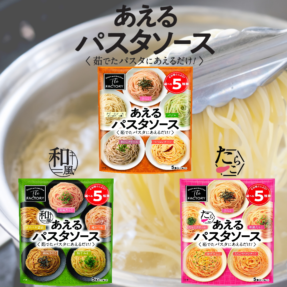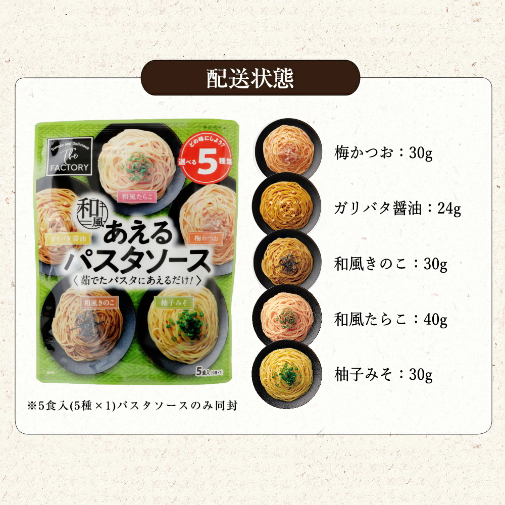 | COMMENT -商品について- 【1袋に5種類の味が入ったパスタソース(和風 5種×1)】 パスタを茹でて、ソースをかけて、あえるだけ。 簡単3ステップ調理で美味しいパスタを召し上がれ! 1袋で5種類の味が楽しめる人気の「あえるパスタソース」 【和風たらこ】 昆布と鰹節の風味でたらこの旨さを引き立たせた和風パスタソース。刻みのりやネギをお好みで! 【梅かつお】 梅を醤油と鰹の風味で仕上げたシンプルな和風パスタソース。梅の香りと程よい酸味を楽しめます。冷製パスタにもピッタリ! 【柚子みそ】 さわやかな香りの柚子とみそが相性抜群!ソースを魚に漬けて焼いたりサラダにかけたりアレンジ自在! 【和風きのこ】 きのこの旨味とソテーオニオンの甘みを昆布の風味で引き立たてました。にんにくも聞いていて炒め物の味付けにもぴったり。 【ガリバタ醤油】 にんにくの芳ばしい香り、バターのコク、醤油の旨味が絶妙なバランス。子供から大人まで愛される味! 【茹でたパスタにあえるだけ!】 1. 沸騰したお湯2リットルに塩小さじ2を入れ、乾麺100gを茹でる。 2. 湯切りしたパスタを皿に移してソースをかける。※ソースを温める必要はありません。 3. よくあえたら完成!お好みでパセリや刻みのりなどをトッピングしてください。 【あえるパスタソース】【あえるスパゲティーソース】【あえるスパゲティソース】【和えるパスタソース】【和えるスパゲティーソース】【和えるスパゲティソース】【まぜるパスタソース】【まぜるスパゲティーソース】【まぜるスパゲティソース】【混ぜるパスタソース】【混ぜるスパゲティーソース】【混ぜるスパゲティソース】【5種類パスタソース】【5種類スパゲティーソース】【5種類スパゲティソース】 SPEC -商品詳細-