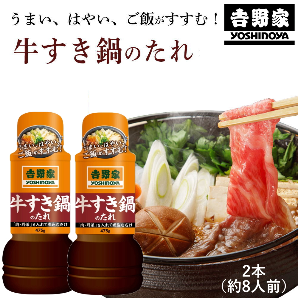| COMMENT -商品について- 【吉野家 牛すき鍋のたれ】 うまい!はやい!ご飯が進む! 自炊派の皆さん、お待たせしました! "煮込むだけ"で、毎日のおかずがお店の味に。 創業120年、吉野家が誇る「うまい・はやい」のノウハウを詰め込みました。 家族も自分も大満足の一品を食卓へお届けします。 【吉野家のたれ 牛すき鍋のたれ】 牛肉や野菜の美味しさを引き出す、旨みが詰まった特製たれ。 1本で4人前! 牛すき鍋以外にも、煮物にしたり、うどんを入れたり、アレンジ自在! 熱々でお召し上がれ! 【牛すき鍋の作り方】 牛肉とお好みの野菜をたっぷり入れて、吉野家の牛すき鍋のたれで煮込むだけ! 忙しい時にこれ1本で簡単に作れます。 〆にご飯を入れて、溶き卵を流しいれれば、旨みが染み込んだ美味しい雑炊の出来上がり! 最後の最後までお楽しみいただけます。 【牛すきだけじゃない!】 照り焼きに使ったり アレンジすき焼きにしたり 色々使えます 【吉野家】【吉野屋】【牛すきのタレ】【牛すきタレ】【牛すきのたれ】【牛すきたれ】【牛すきの素】【牛すき素】【牛すきのもと】【牛すきもと】【すき焼きのタレ】【すき焼きタレ】【すき焼きのたれ】【すき焼きたれ】【すき焼きの素】【すき焼き素】【すき焼きのもと】【すき焼きもと】 SPEC -商品詳細-