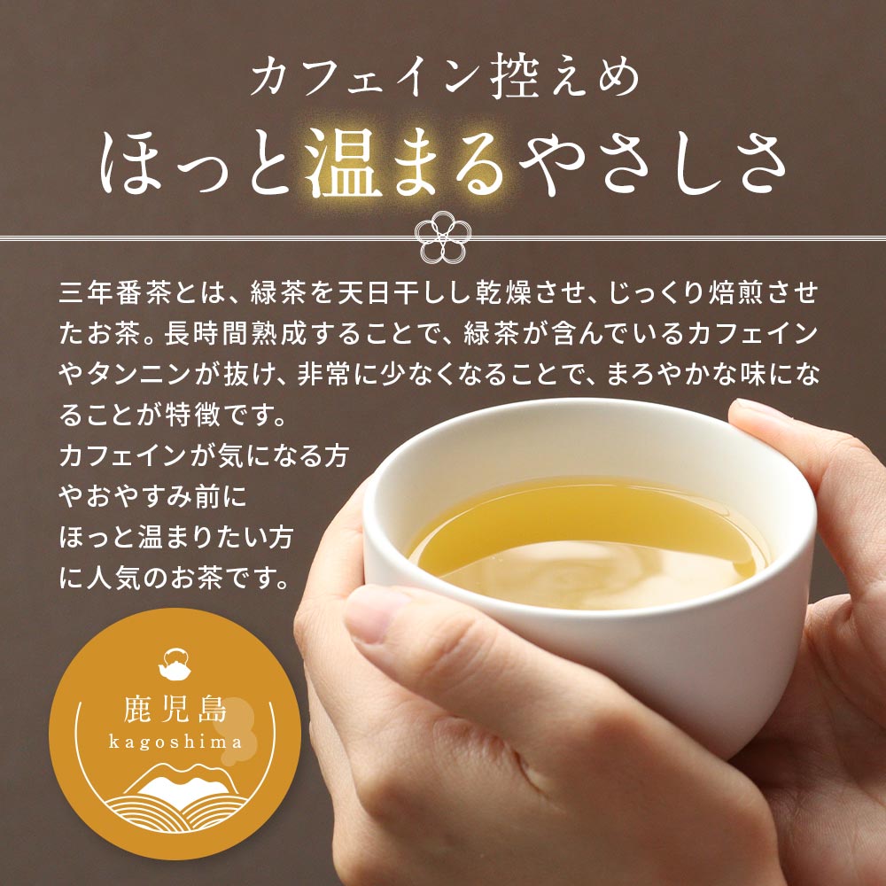 【商品名】有機栽培さつまの三年番茶【名称】有機三年番茶(ティーバッグ)【原材料】有機緑茶(鹿児島県産)【内容量】200g(2gx100包)【保存方法】直射日光、高温多湿を避けて保存してください。【賞味期限】別途商品ラベルに記載【販売者】株式会社オーガランド〒899-4341鹿児島県霧島市国分野口東1294番1【キーワード】無農薬 かごしま茶 ペットボトル 粉末 有機JAS 化学合成 農薬不使用 おすすめ 三年番茶とは 入れ方 カテキン カフェイン ローカフェイン 低カフェイン 控えめ 有機3年番茶 有機栽培茶 3年番茶 作り方 効果 効能 タンニン 熟成 水出し緑茶 水出し番茶 水出し茶 マクロビオティック 鹿児島 健康茶 お茶 国産 有機JAS認証 有機茶 オーガニック茶 ティーバッグ 日本茶 緑茶 リラックス 三年間熟成 番茶 上品 香ばしい香り 寝る前 リラックスタイム 子供 こども 子ども マクロビ お徳用 鹿児島県産 カフェイン控えめ 茶 ファスティング オーガニック 有機 母の日 父の日 敬老の日 ギフト プチギフト
