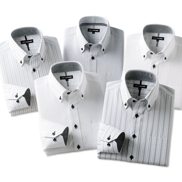 ホワイトとグレーのモノトーンでまとめた、洗練された印象のシックな定番ワイシャツ。ジャケット無しでも衿元がすっきり決まるボタンダウン仕様。お手入れが簡単な形態安定加工で、袖丈は通常タイプと3cm短いタイプから選択できます。定番のホワイト2枚、ストライプ柄3枚の5枚セットです。