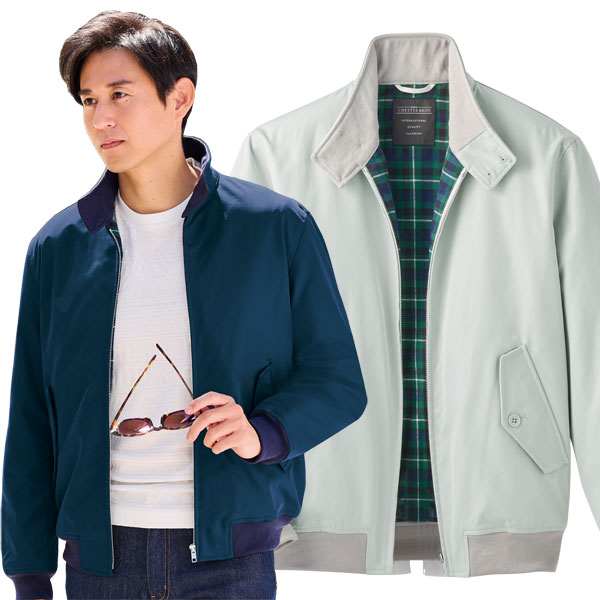 しっかりとしたハリ感があるはっ水素材のブルゾンは、タウンユースからゴルフ等のスポーツシーンまで活躍してくれる定番アイテムです。裏地はお洒落なチェック柄、袖口と衿裏はリブ仕様になっています。何かと便利な内ポケット2つ付き。合わせやすい定番カラーのネイビーとグレーの2色からお選びいただけます。