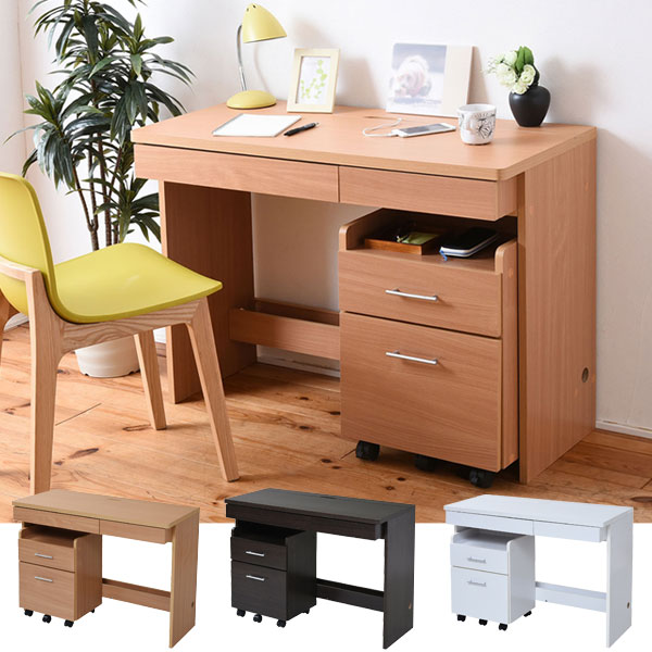 コンパクトタイプのサイドチェスト付きパソコンデスク。天板にコード通し穴があり、足元には電源タップを収納する専用スペースが設けられた電源が取りやすい設計。パソコンやタブレット、スマートフォンが使いやすいと評判。幅100cmのコンパクトタイプだから狭いスペースでも設置が可能。流行りのリビング学習用の机や仕事用のパソコンデスクとして活躍します。引き出しはデスクに2杯、サイドチェストに2杯付いています。サイドチェストの引き出しはA4サイズのファイルがらくらく収納できる実用的な広さ。キャスターが5箇所に付いているから引き出しを開けても傾かない安全設計。天板は汚れや水に強いPVC(塩化ビニル)仕上げのため、汚れてもサッと水拭きしてお手入れが可能。
