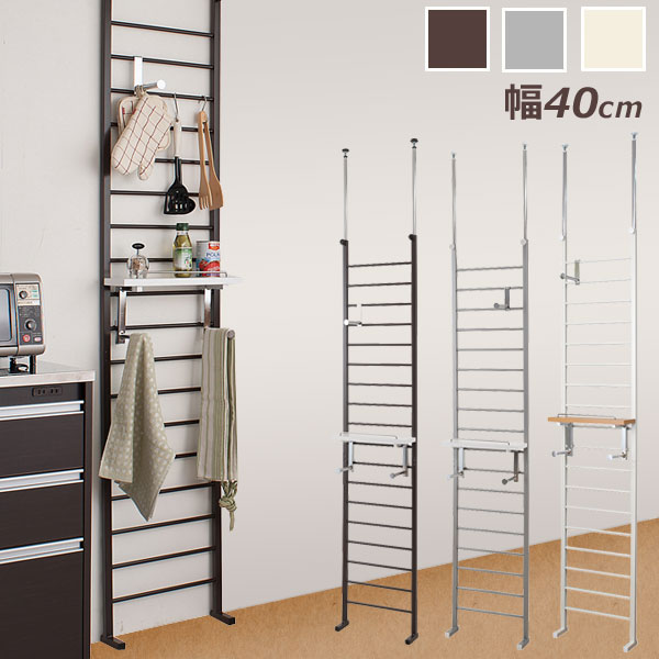 国産の高い品質の高いラダーラック。はしごの様なデザインからついた名前で、インテリア性が高く、キッチンやリビング等、さまざまなシーンで活躍します。高さが調整できるつっぱり式だから、高さが約200〜260cmまでのお部屋に対応します。フックや棚板を自由に設置できるので、使う人に合わせたオリジナルの使い方ができます。カラーは、シルバー、アイボリー、ダークブラウンのの3色でお部屋の雰囲気に合わせてお選び頂けます。また、設置する場所に合わせて幅40、65、95cmからお選び頂けます。