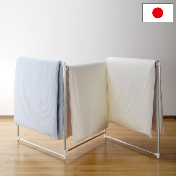 ふとん干しが手軽にできるアルミ製折りたたみ布団干し。軽量なアルミ素材を使用しており、わずか約2.6kgと女性でも楽に持ち運び可能。スペースに合わせて、形や角度を自由に調整できるから、限られたスペースでも効率よく使えます。ふとんだけでなく、布団カバーやシーツなど大きな洗濯物もしっかり干せる広々スペース。使わない時は折りたたんで約7cmの薄さに。クローゼットのすき間や家具の横にサッと収納できて、場所を取りません。