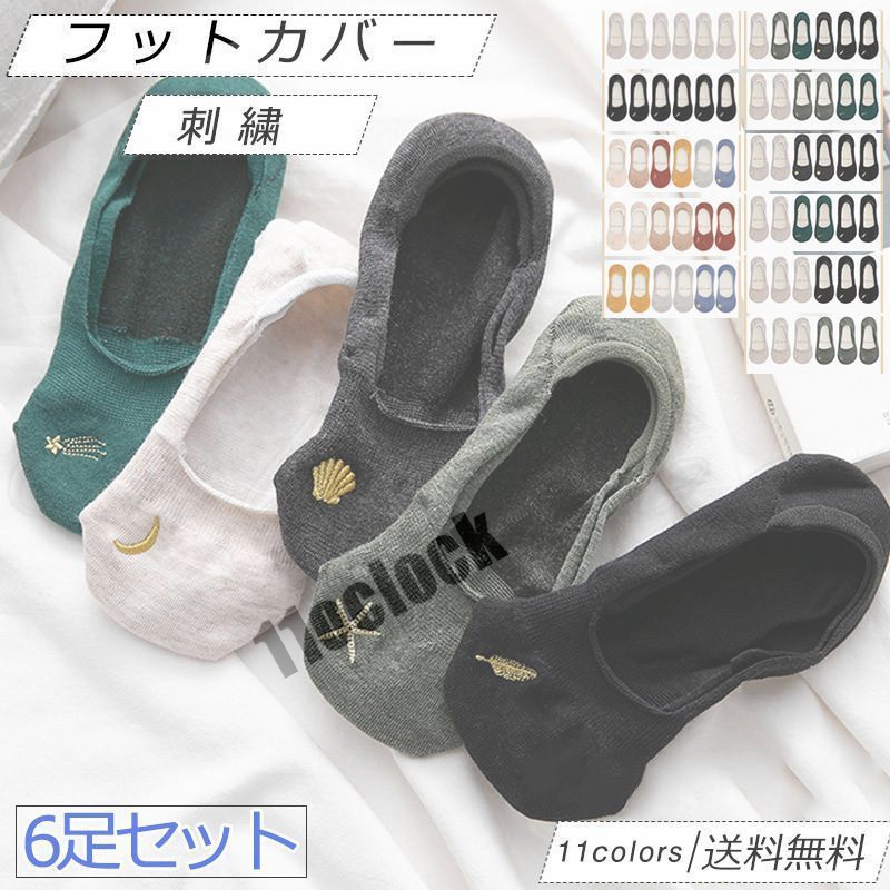 フットカバー レディース パンプスイン 刺繍 6足セット 薄い 浅履き かかと滑り止め 履きやすい 靴下 美脚 女性用 きれいめ おしゃれ