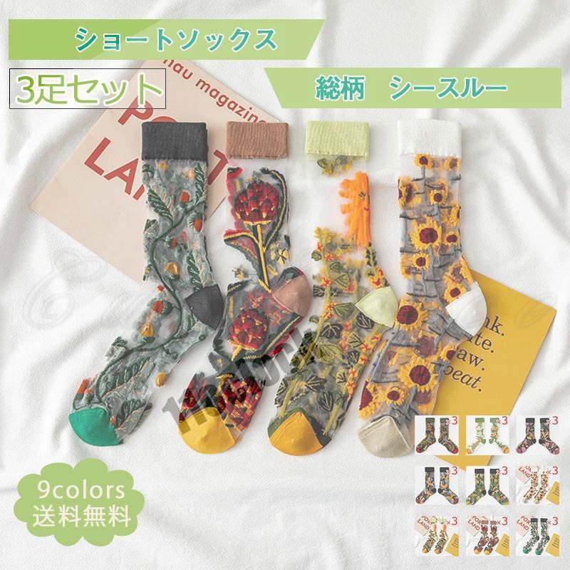 ショートソックス レディース 靴下 3足セット 総柄 シースルー メッシュ 薄手 美脚 通気性 履きやすい 可愛い 21年夏新作 きれいめ おしゃれ