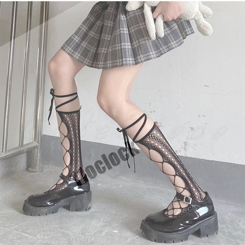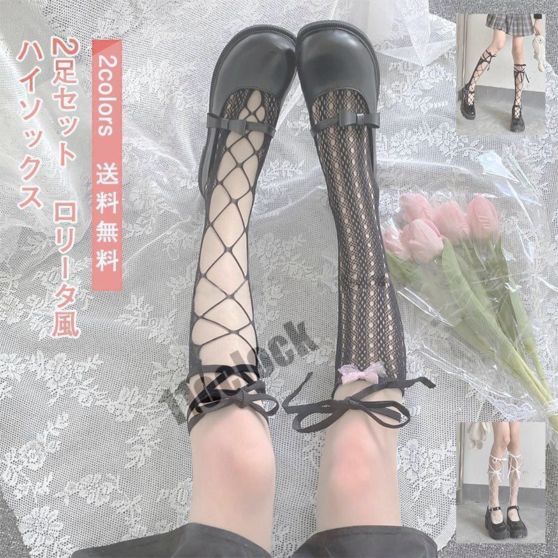 ハイソックス レディース ロングソックス ちょう結び レース付き花柄メッシュ 2足セット ロリータ風 コスプレ 履きやすい 美脚 きれいめ おしゃれ