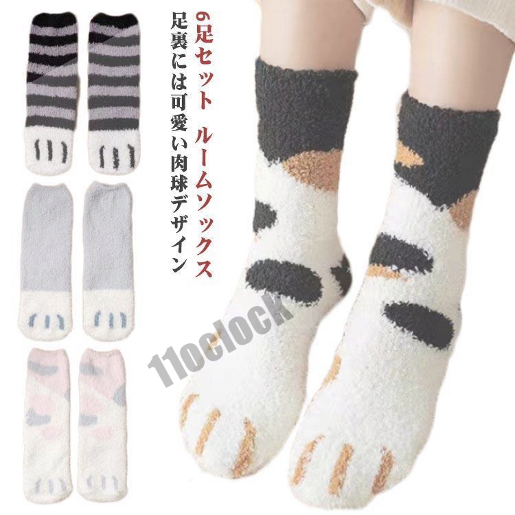 ネコちゃんデザイン ふわふわ 6足セット 猫柄 あったか ソックス 靴下 6足セット ルームソックス もこもこ 暖かい 厚手 ねこ レディース にゃん